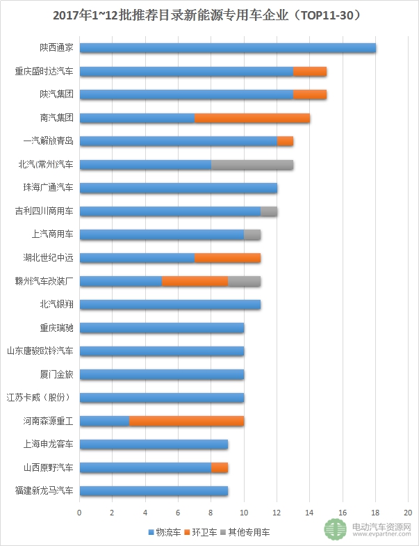 推薦目錄內(nèi)車型數(shù)量排名11~30位的企業(yè)有陜西通家、重慶盛時達、陜汽集團、南汽集團、一汽解放青島、北汽(常州)汽車、珠海廣通汽車、吉利商用車、上汽商用車、湖北世紀中遠、贛州汽車改裝廠、北汽銀翔、重慶瑞馳、唐駿歐鈴、廈門金旅、江蘇卡威(股份)、森源重工、申龍客車、原野汽車、福建新龍馬。